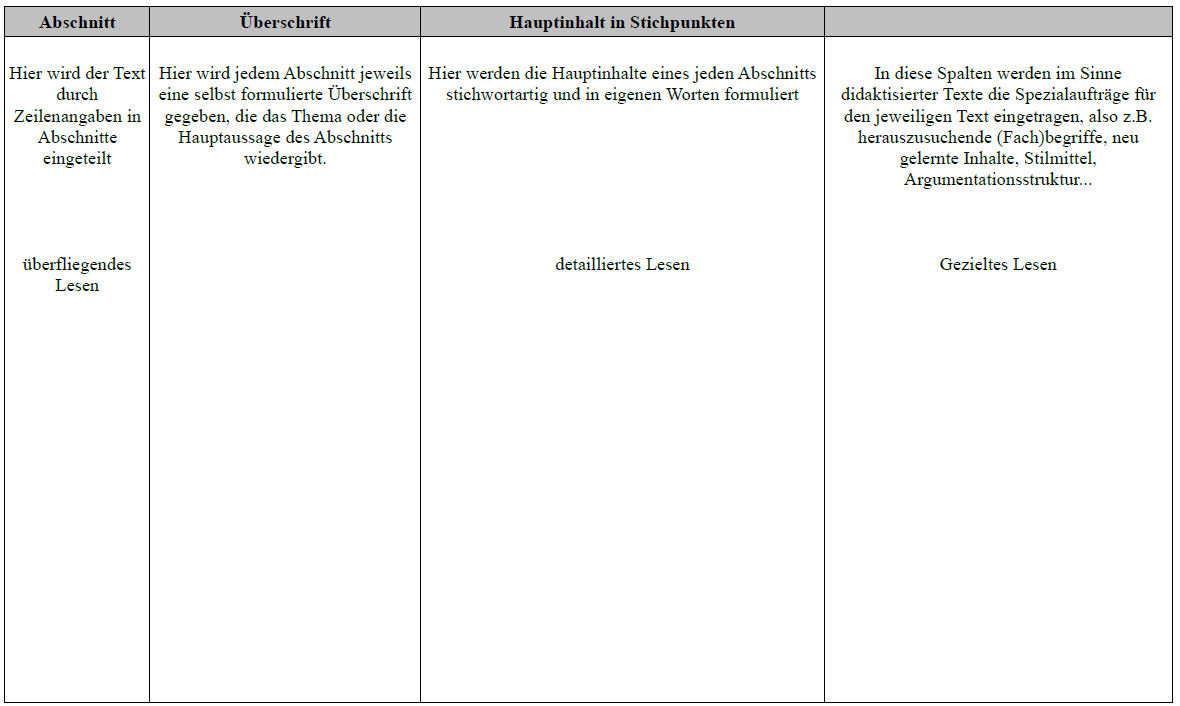 Bei dieser mindestens vierspaltigen lesebegleitend auszufüllenden bzw. von den Lesenden zu erstellenden Tabelle wird der Text von den Lesenenden zunächst in Abschnitte eingeteilt (Spalte 1). Diesen werden dann Überschriften in eigenen Worten gegeben (Spalte 2) und anschließend wird der Inhalt in eigenen Worten stichpunktartig wiedergegeben (Spalte 3).