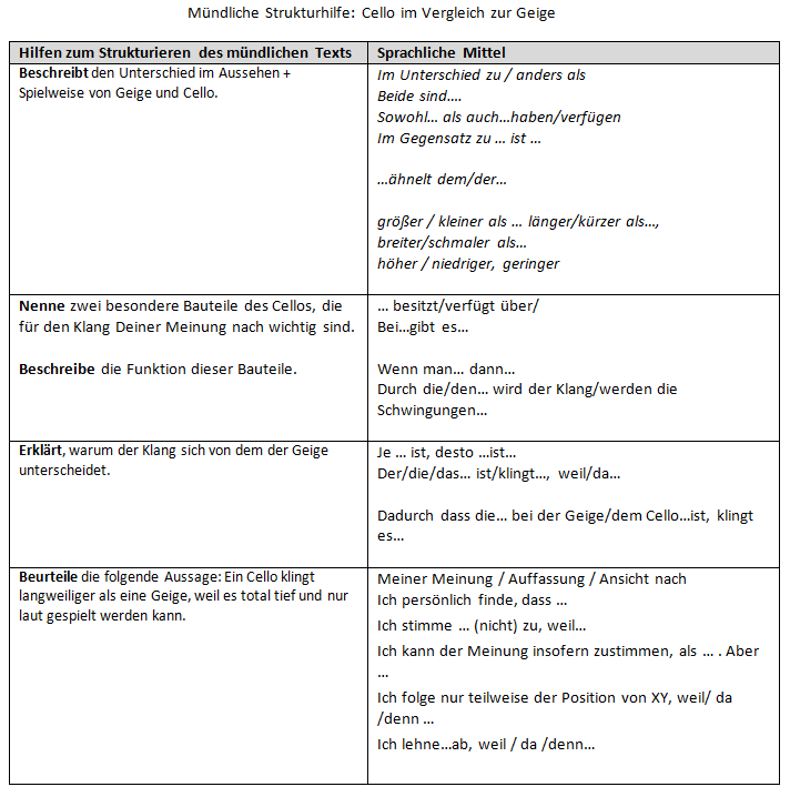 Das folgende Beispiel aus dem Musikunterricht illustriert, dass strukturierte Sprechhilfen bei nahezu allen Arbeitsaufträgen (auch aus Lehrbüchern) sehr fruchtbar genutzt werden können. Dafür werden die evtl. schon vorhandenen, im besten Fall in sich gestuften und aufeinander aufbauenden Arbeitsaufträge, wie sie in den meisten Lehrbüchern auftreten, schlicht in die linke Spalte übernommen (und ggf. ergänzt).