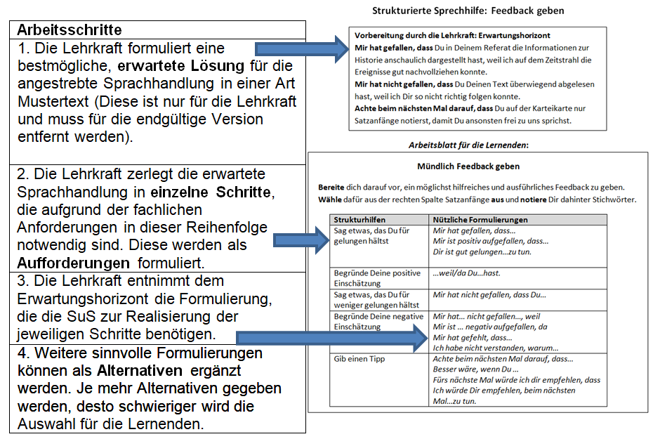 In einer strukturierten Sprechhilfe (die natürlich auch für schriftliche Texte verwendet werden kann), werden in einer zweispaltigen Tabelle links Anweisungen zur Struktur des erwarteten Texts gegeben und in der rechten Spalte jeweils zu verwendende Satzanfänge.