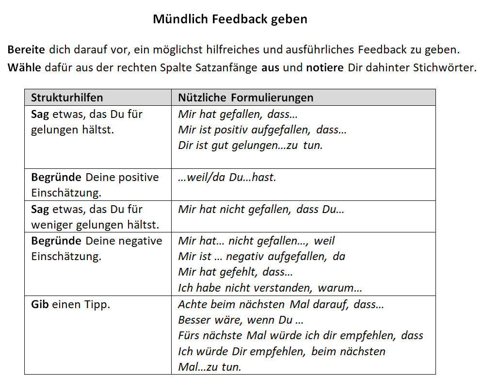 In derartige Reflexionsprozesse können auch die Schülerinnen und Schüler auf vielfältige Weise aktiv eingebunden werden, indem sie spezielle Höraufträge, z.B. in Form von Checklisten, erhalten. Damit dieses Feedback ressourcenorientiert (Lob für Positives, Verbesserungsvorschläge als Tipps formuliert) gegeben und angenommen werden kann, können neben Regeln auch gleich noch Formulierungen für ein gutes Feedback ergänzt werden wie im folgenden Beispiel: